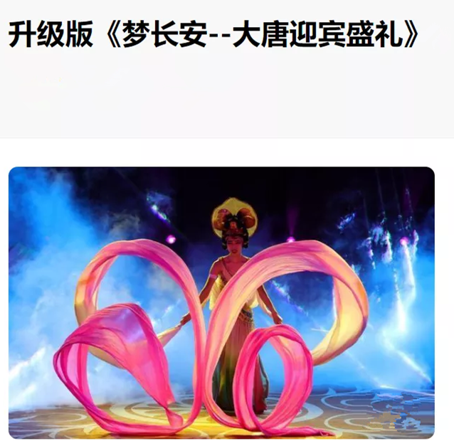 《夢長安——大唐迎賓盛禮》是世界唯一的以盛唐禮儀文化為主題的旅游文化演出,是中國僅有的國賓級迎賓儀式,以行進體驗式的表演形式,堪稱“天下第一禮”。1996年在世界古都大會首次正式亮相,自2014年提升演變?yōu)槌菈ζ放莆幕莩,接待過美國總統(tǒng)克林頓、新加坡總理吳作棟、印度總理莫迪等貴賓,享譽海內(nèi)外。