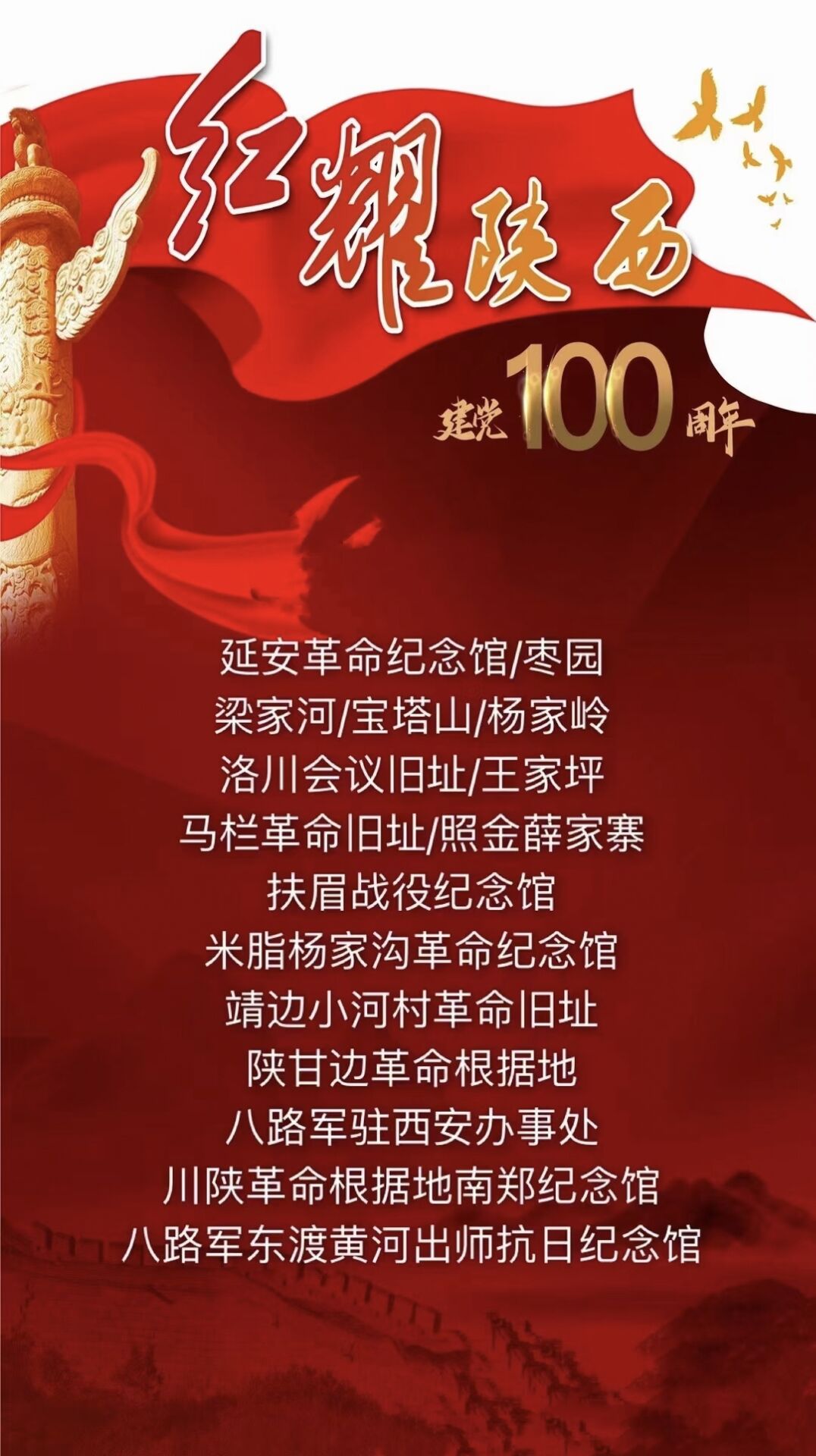 為深入貫徹習(xí)近平新時(shí)代中國特色社會主義思想,隆重慶祝中國共產(chǎn)黨成立100周年,充分展示中國共產(chǎn)黨帶領(lǐng)全國各族人民在中國革命、建設(shè)、改革歷史進(jìn)程中取得的重大成就,引導(dǎo)干部群眾就近就便開展實(shí)地考察、國情調(diào)研,近日,文化和旅游部、中央宣傳部、中央黨史和文獻(xiàn)研究院、國家發(fā)展改革委聯(lián)合發(fā)布“建黨百年紅色旅游百條精品線路”。